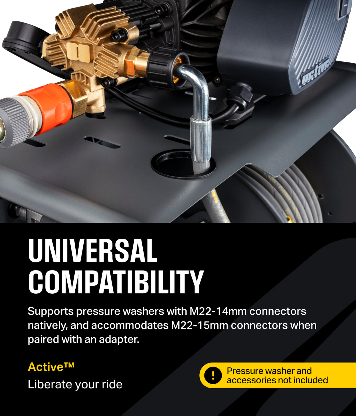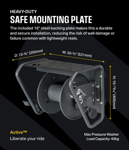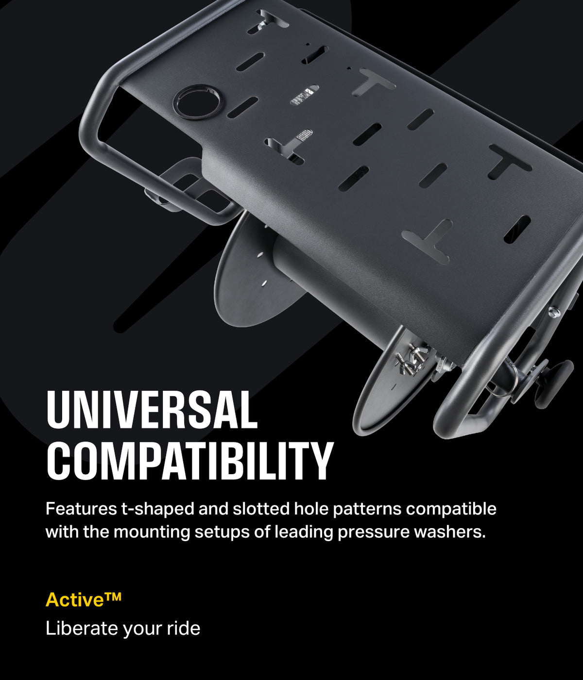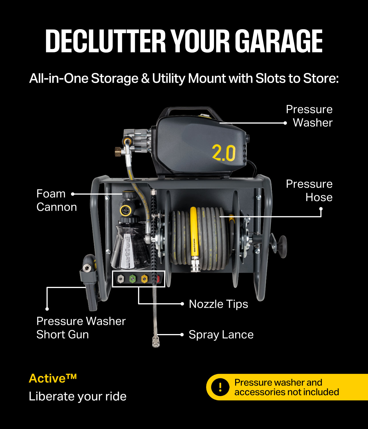 The Active hose reel wall mount solution an all-in-one garage solution that keeps pressure washer setups organized, accessible, and clutter-free. Designed for safe, straightforward mounting and universal compatibility, it offers smart storage for hoses and accessories while being perfectly optimized for the Active lineup.