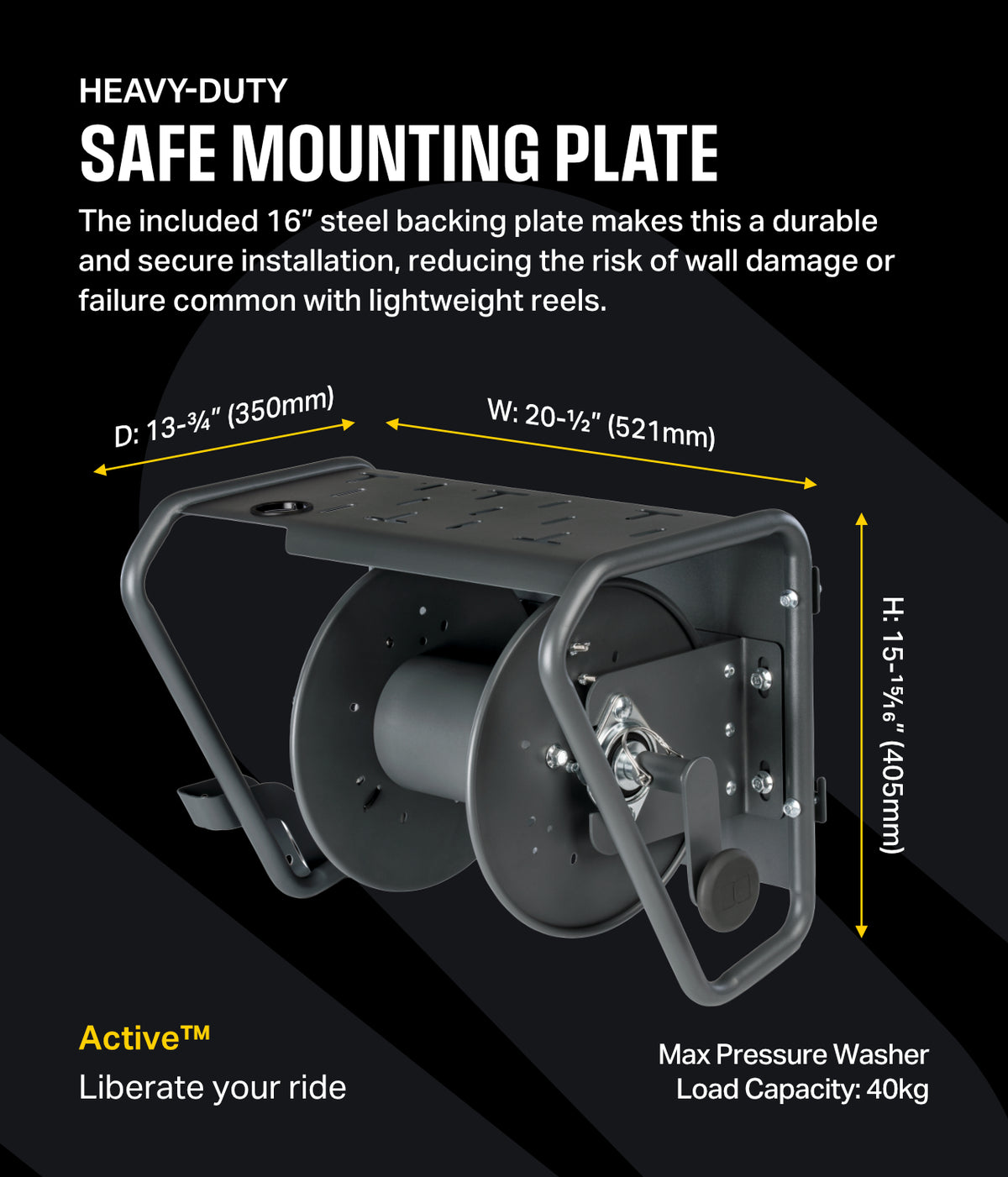 The Active pressure washer wall mount and hose reel combo is meant to seamlessly integrate with the customers product experience when using Active pressure washers and accessories. Not only is it suited for our product program but can be a suitable upgrade kit for all pressure washer users when it comes to enhancing their car wash experience.